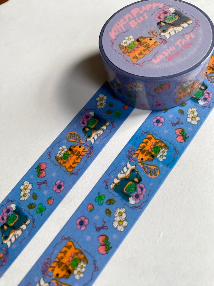 Kitten Puppy Bus Washi Tape. Each tape rotates through four designs on four different colors. Tape is 20mm x 10m.